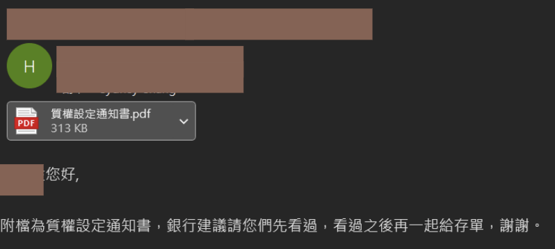 收到回覆後,我們也安心了,感覺是差不多啊,雖然文字比較少,但是小白如我們,哪知道有甚麼差異啊,好勒,既然沒問題,那我們就將這張質權設定通知書連同定存單影本一起提交給質權人公司審核啦!
